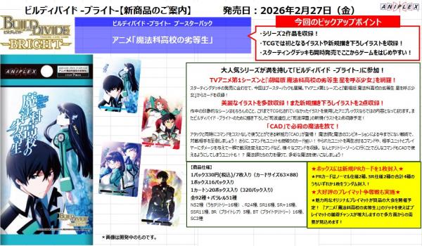 作中の印象的なシーンはもちろんのこと、これまでTCG化されていなかったイラストを使用したアニプレックスならではの内容となっております。またビルディバイド -ブライト-のために描き下ろした「司波達也」と「司波深雪」の新規イラストを2点収録予定!